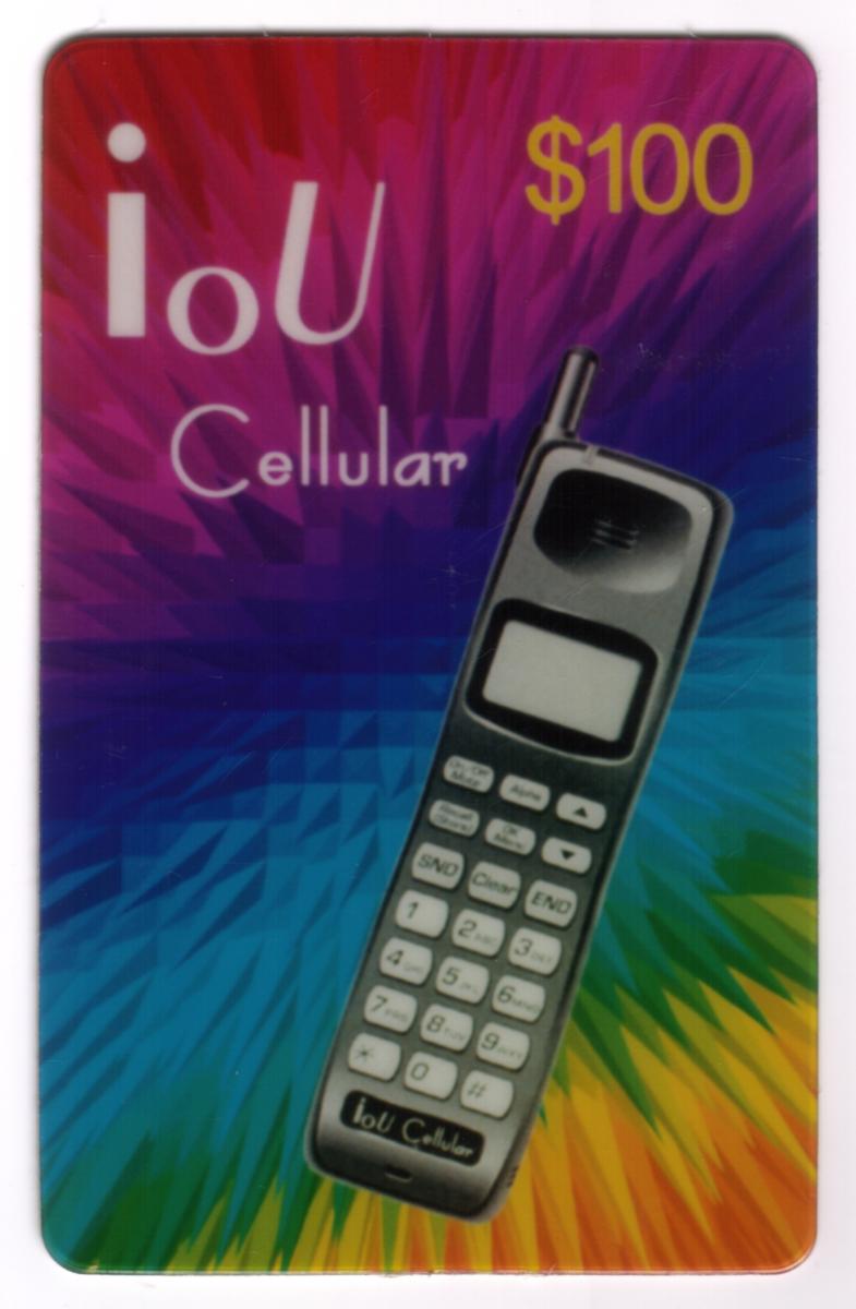 This collectible card relates to prepaid cellular phone time and represents the ioU Network Services. It highlights early cellphone technology with artistic and colorful design elements. The $100 denomination signifies the phone card's value for prepaid cellular usage.