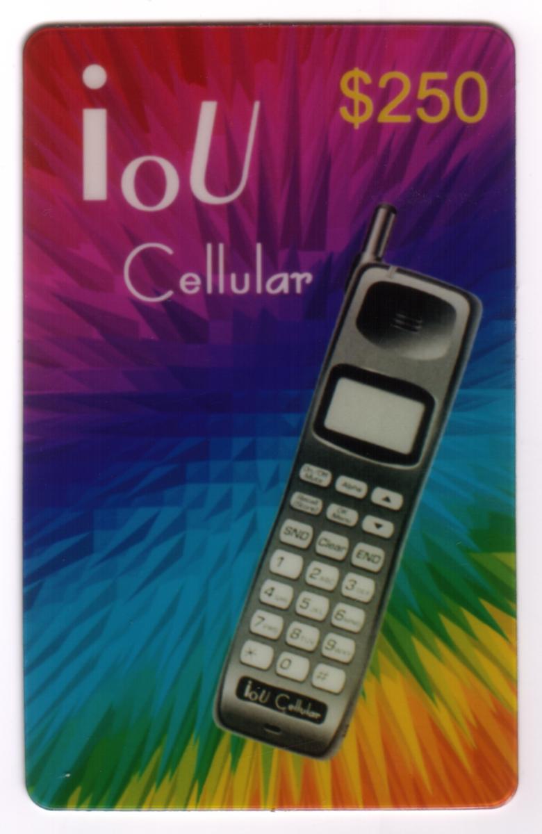 The card is associated with prepaid cellular phone time valued at $250, indicating its use for mobile phone services. The branding on the card includes "ioU Network Services," identifying the provider linked to the prepaid cellular phone credit. The overall artwork is bright and visually appealing, incorporating bold colors to draw attention to the theme of phones and telecommunication.
