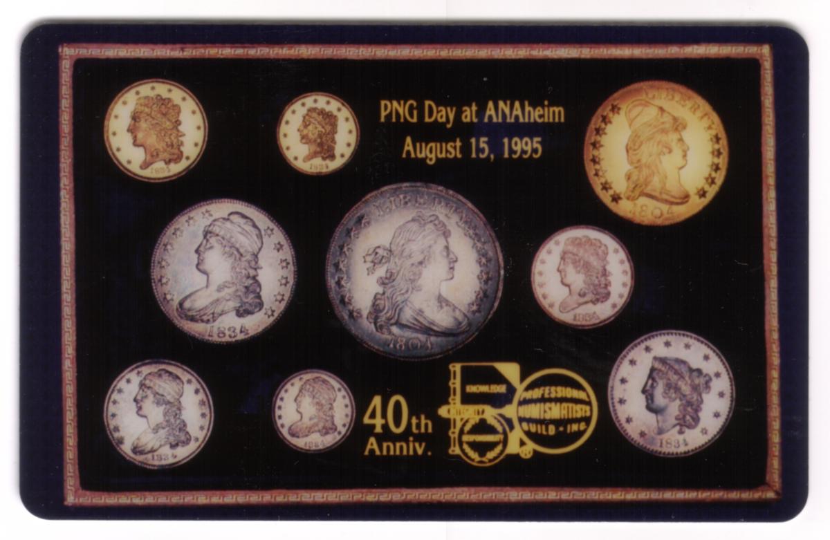 This collectible card, marked with SKU-23581, commemorates "PNG Day at ANAheim" held on August 15, 1995. It prominently features various historic coin designs, including an 1804 silver dollar, set against a black background framed by a thin gold border. The card celebrates the 40th Anniversary of the Professional Numismatists Guild (PNG), indicated by the gold emblem with the number "40th Anniv." and the words "Professional Numismatists Guild - 1955-1995" in a circular design.
