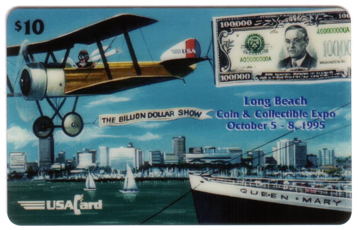 1995 Long Beach Coin & Collectible Expo $10 card featuring skyline, Queen Mary, vintage biplane, and a $100,000 banknote for collectors and enthusiasts. |