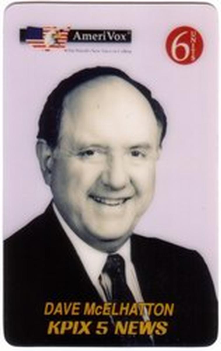 This collectible phone card features a design dedicated to Dave McElhatton, a notable television news reporter for Channel 5 KPIX News located in Oakland, California. The card highlights the field of journalism and broadcasting within the San Francisco Bay Area. The front of the card prominently displays the KPIX Channel 5 logo alongside the name “Dave McElhatton,” emphasizing his association with CBS News as a reporter and media figure.