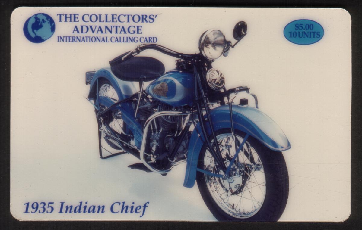 Text on the card includes the brand name "Indian Motorcycle" along with the year "1935" and the model name "Chief." The card also features the logos and text for "Mercury Marketing" and "Internet Communications Services Inc," indicating the companies associated with its production or distribution. The denomination is clearly marked as "$5 (10u)," specifying its value for use. The phrase "The Collectors’ Advantage" appears prominently, highlighting the card’s appeal to collectors.