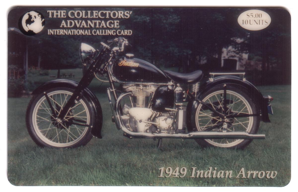 This collectible phone card features a detailed image of a 1949 Indian Arrow motorcycle, a classic model produced by Indian Motorcycle. The motorcycle is presented prominently with clear details, emphasizing its vintage design and distinctive styling. The card’s artwork captures the essence of mid-20th-century motorcycling and pays tribute to the iconic brand known for its rich history in American motorcycles.