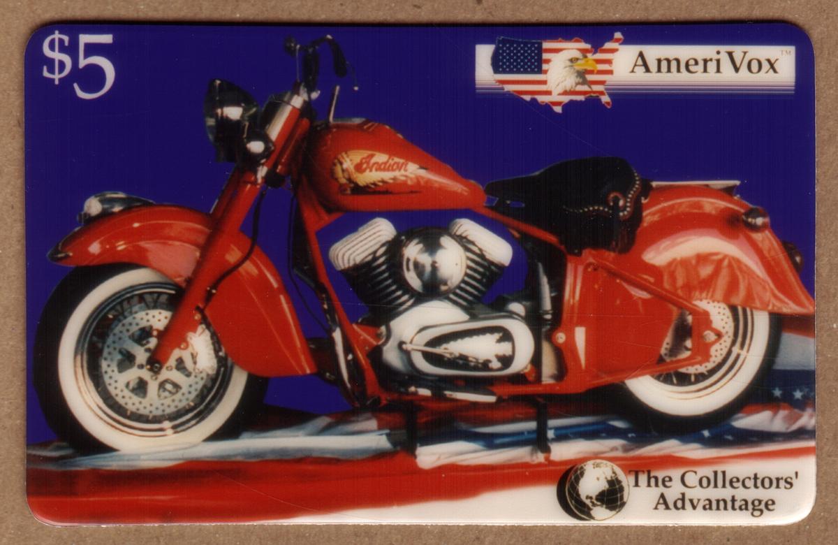 This collectible card features a vivid image of a red Indian Chief motorcycle with detailed chrome and whitewall tires. The motorcycle is prominently displayed in side profile against a blue background. The word "Indian" is clearly visible on the fuel tank in gold script.