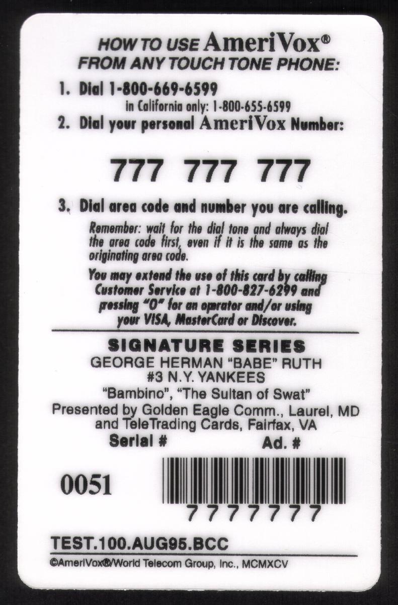 At the top left corner, the AmeriVox logo appears alongside the text “The world’s #1 phone card.” Below the photograph, the card displays Babe Ruth’s signature in cursive script, followed by the text "SIGNATURE SERIES" in capital letters. Beneath that, the text reads "© Babe Ruth by CMG, Indpls, IN."
