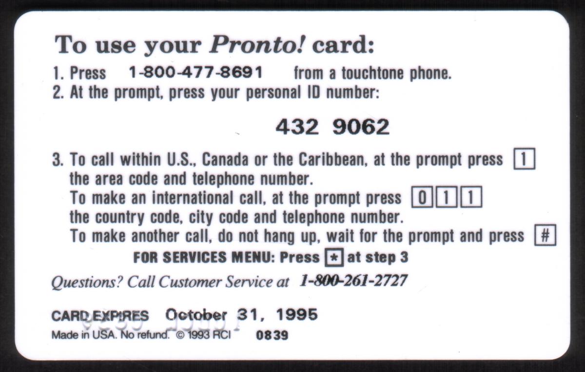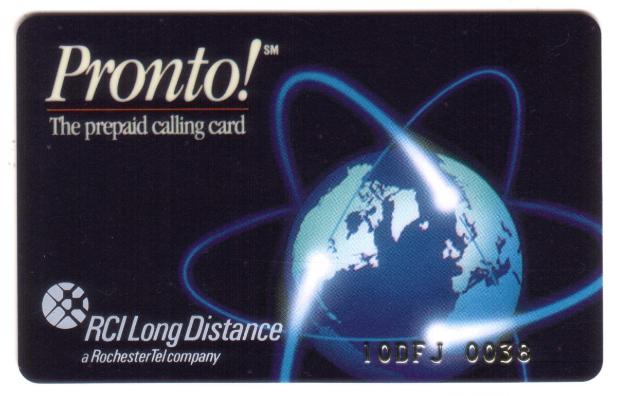 This calling card highlights themes of communication across the globe using satellite technology, reinforced by the use of the Earth globe and orbit lines. It is a product linking Rochester Telephone’s RCI Long Distance service with the Pronto! prepaid calling card brand.