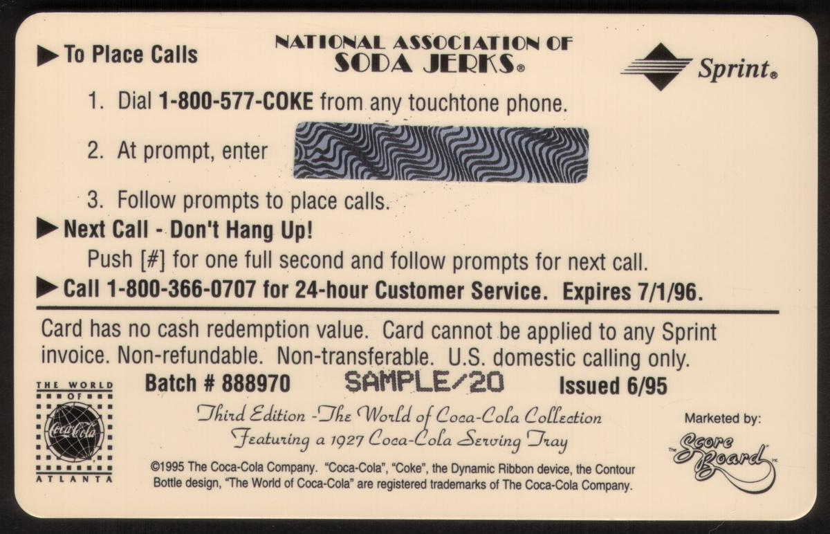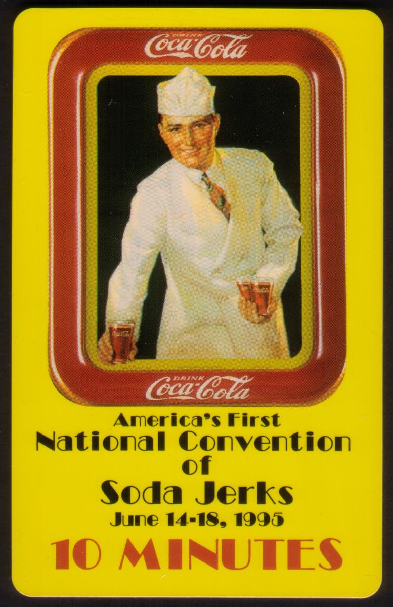 This card is part of The Score Board Inc.'s World of Coke series and is recognized by the markings for 10 minutes of usage time. It commemorates the soda jerk profession and the special convention held in 1995, blending nostalgic imagery with brand identity.