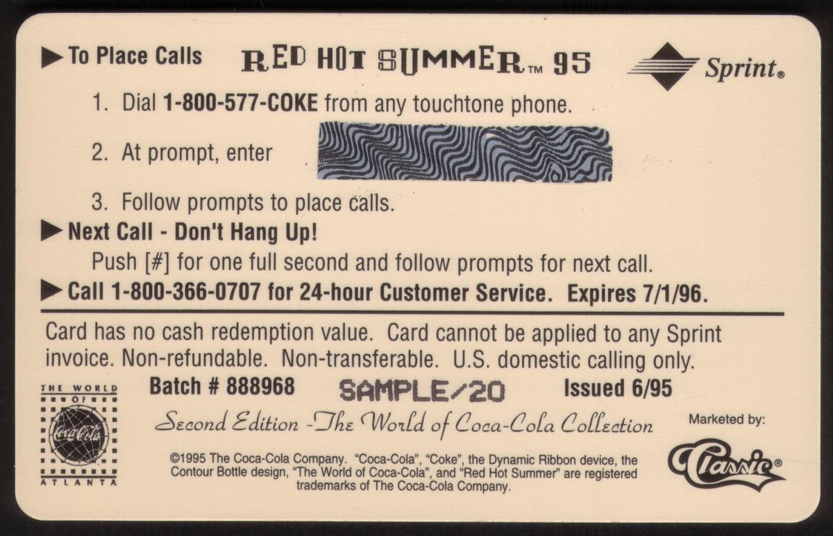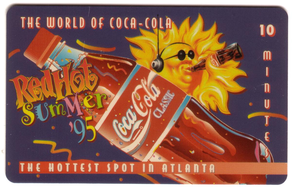 This collectible phone card highlights Coca-Cola’s branding in conjunction with a summer 1995 promotional theme centered around Atlanta, Georgia. The artwork reflects a lively and upbeat mood consistent with Coca-Cola’s advertising style during that period.