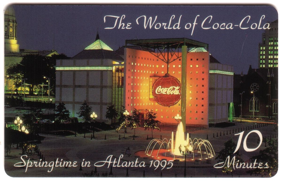 Text on the card reads "The World of Coca-Cola" at the top, "Springtime in Atlanta 1995" at the bottom left, and "10 Minutes" at the bottom right, signaling the card’s value for phone usage. The words are written in elegant white script that contrasts with the dark night sky and the illuminated building. The design effectively captures the iconic Coca-Cola branding and the festive atmosphere of the landmark site.