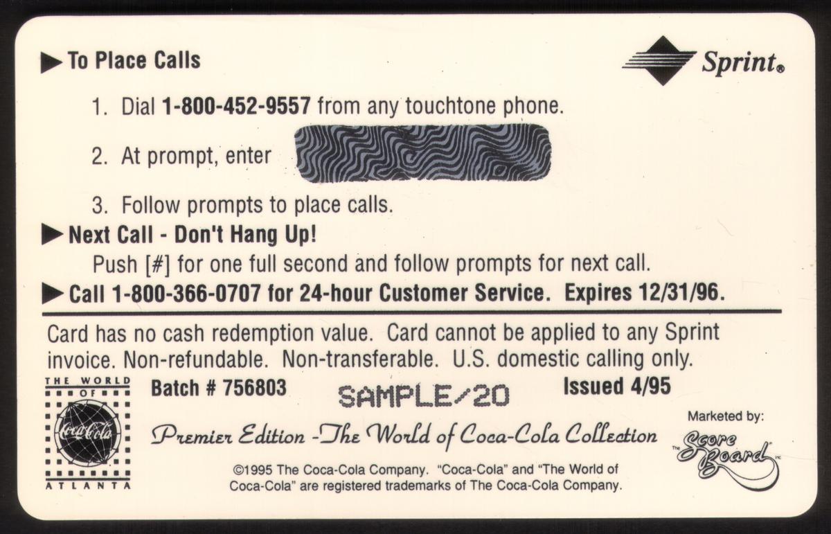 This card was issued by The Score Board Inc. and is part of a live sample series showcasing Coca-Cola logos and the World of Coke building in Atlanta during springtime of 1995. It serves as a collectible item highlighting one of Atlanta’s well-known attractions associated with the Coca-Cola Company.