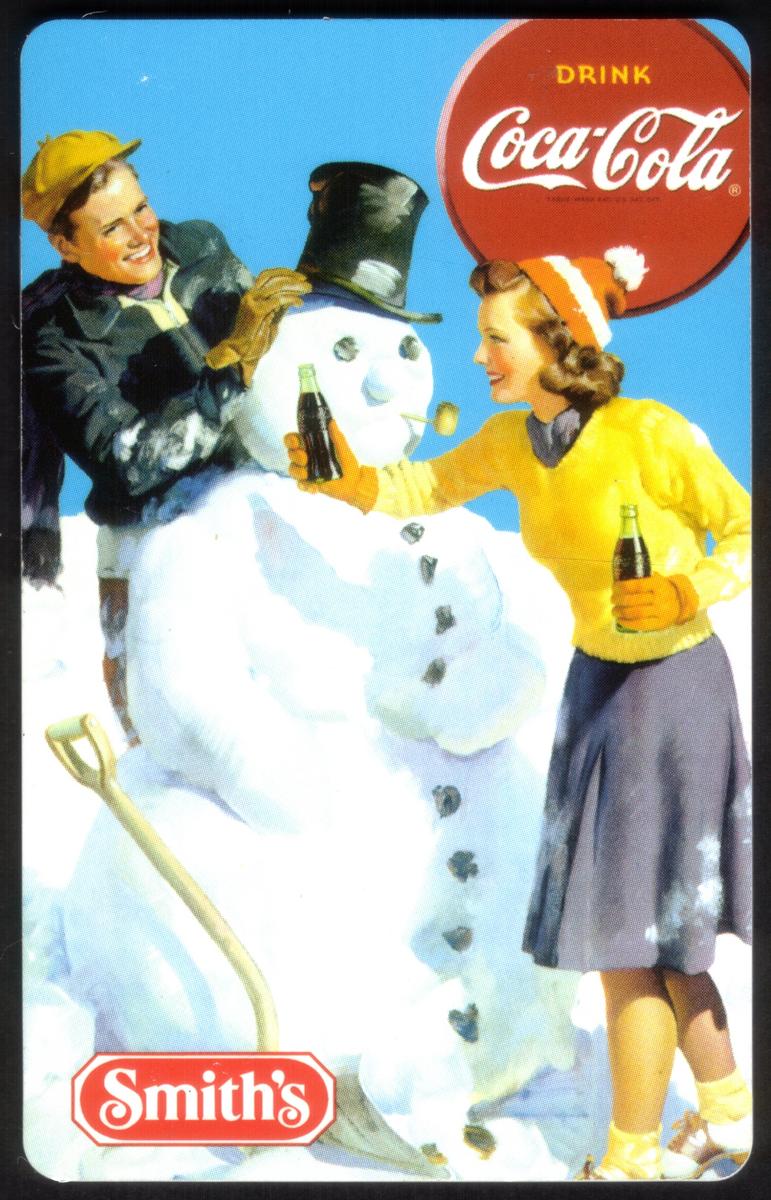 Centered on the card is an illustration of a snowman and a young boy, styled vertically. The snowman holds a classic Coca-Cola bottle, while the boy is reaching out towards it, connecting the theme to the winter holiday season. The figures are colorful, and the background contains snowy elements, reinforcing the seasonal theme typical of Coca-Cola’s advertising campaigns.