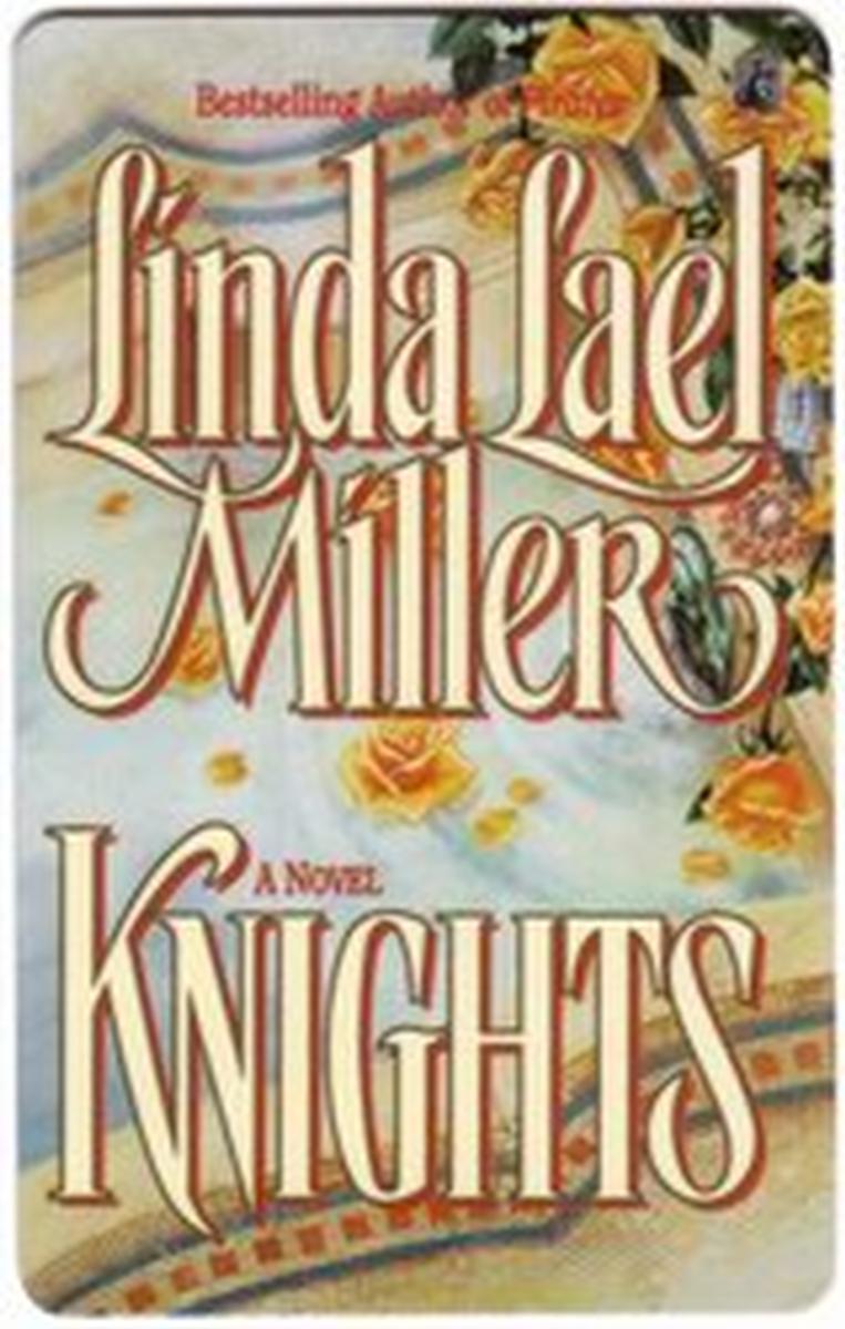This collectible phone card features the cover art of the novel *Knights (A Novel)* by Linda Lael Miller. The central image depicts an open book with text displayed on its pages, emphasizing the themes of reading and literature. Surrounding the book is a detailed artistic arrangement of flowers and jewels, intricately woven in bright colors, creating an elegant and decorative frame that enhances the literary focus.