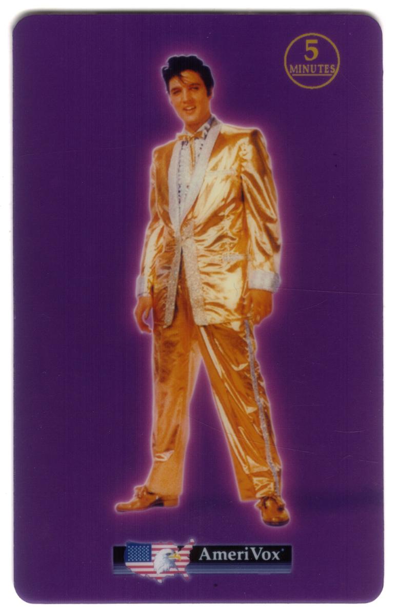 In the upper right corner, there is a gold circular emblem with the text "5 MINUTES," indicating the card's usable time value. At the bottom center of the card, the AmeriVox logo is displayed alongside a small American flag and a white eagle, representing the brand that issued the card. The overall design emphasizes Elvis Presley, known as the King of Rock and Roll, a famous singer, actor, and celebrity connected with Hollywood and entertainment history.