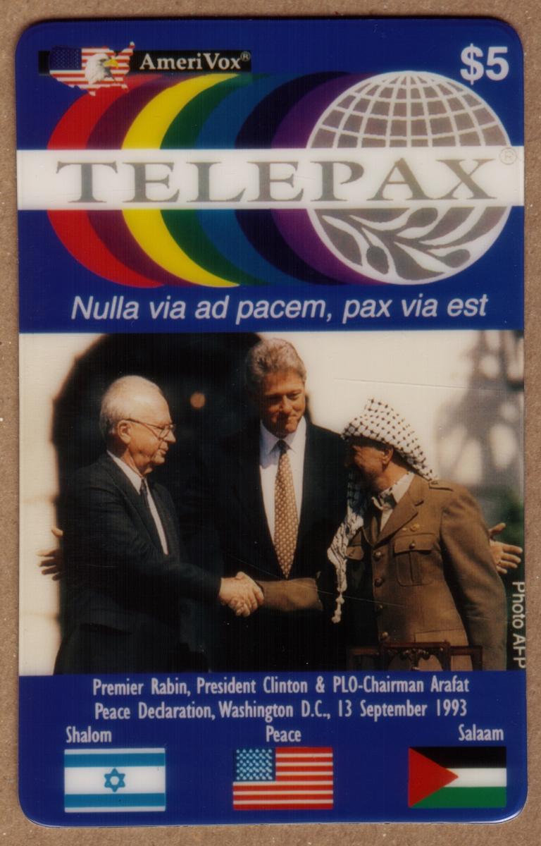 This collectible TelePax phone card, issued by AmeriVox, carries a denomination of $5. The design prominently features a historic photograph of Israeli Prime Minister Yitzhak Rabin, U.S. President Bill Clinton, and Palestine Liberation Organization Chairman Yasser Arafat. The three leaders are shown together during the Peace Declaration event held in Washington, D.C., on September 13, 1993.