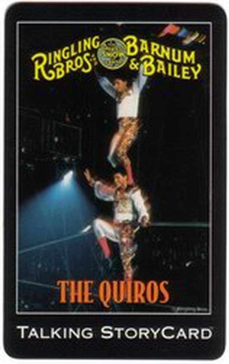 The card includes printed text with the performer’s name, "Roberto Quiros," and references the Ringling Bros. and Barnum & Bailey Circus, reinforcing its association with this renowned circus troupe. The card also features the phrase "Talking Storycard," indicating it is part of a series of collectible talking cards produced by Phoneworks / US Wats.