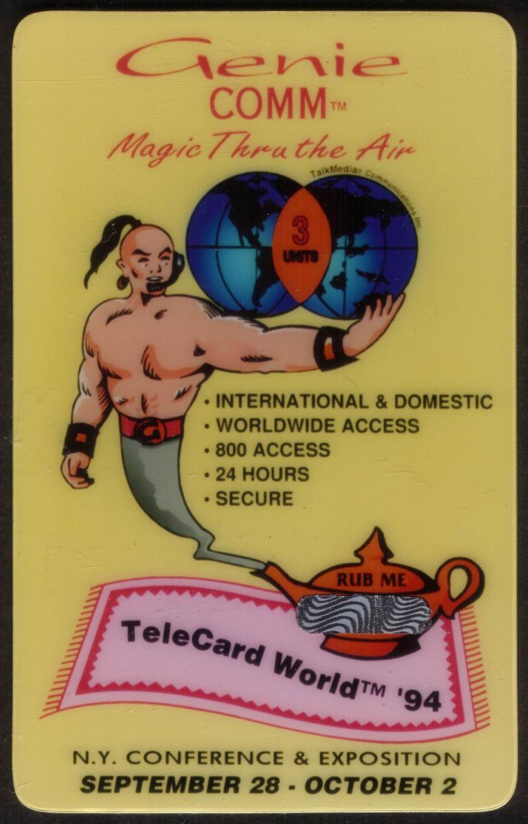 The card is an example of a collectible telecard linked to a specific industry event in 1994 in New York City. It reflects the marketing and branding efforts of associated companies such as Colorfast Marketing Systems Inc and Advance Audio Communications, alongside the branding of Genie Comm. This card’s design and text document this historic conference and exposition clearly and distinctly.