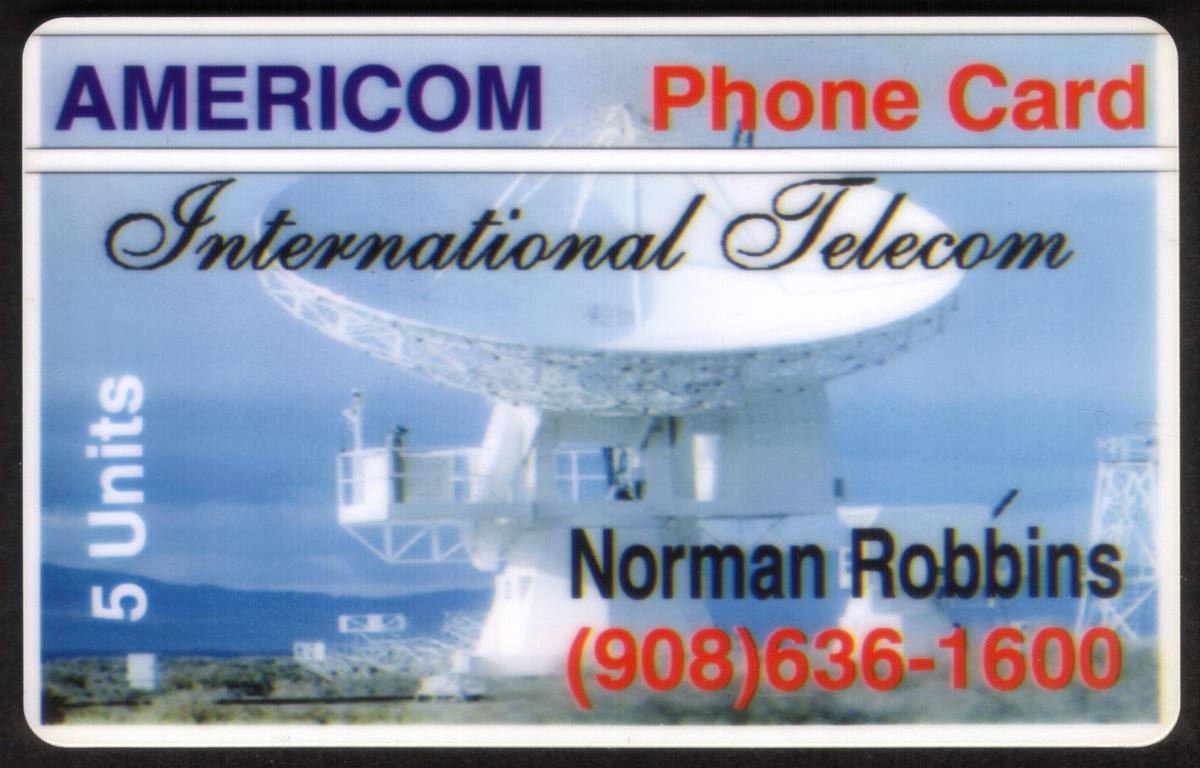 The card highlights various branding elements related to international satellite communications. The combination of corporate names and keywords such as Satellites 5u International Telecom and Americom International confirm the card’s association with telecommunications technology and satellite services. The presence of Norman Robbins’ name further personalizes the promotional aspect of the item.