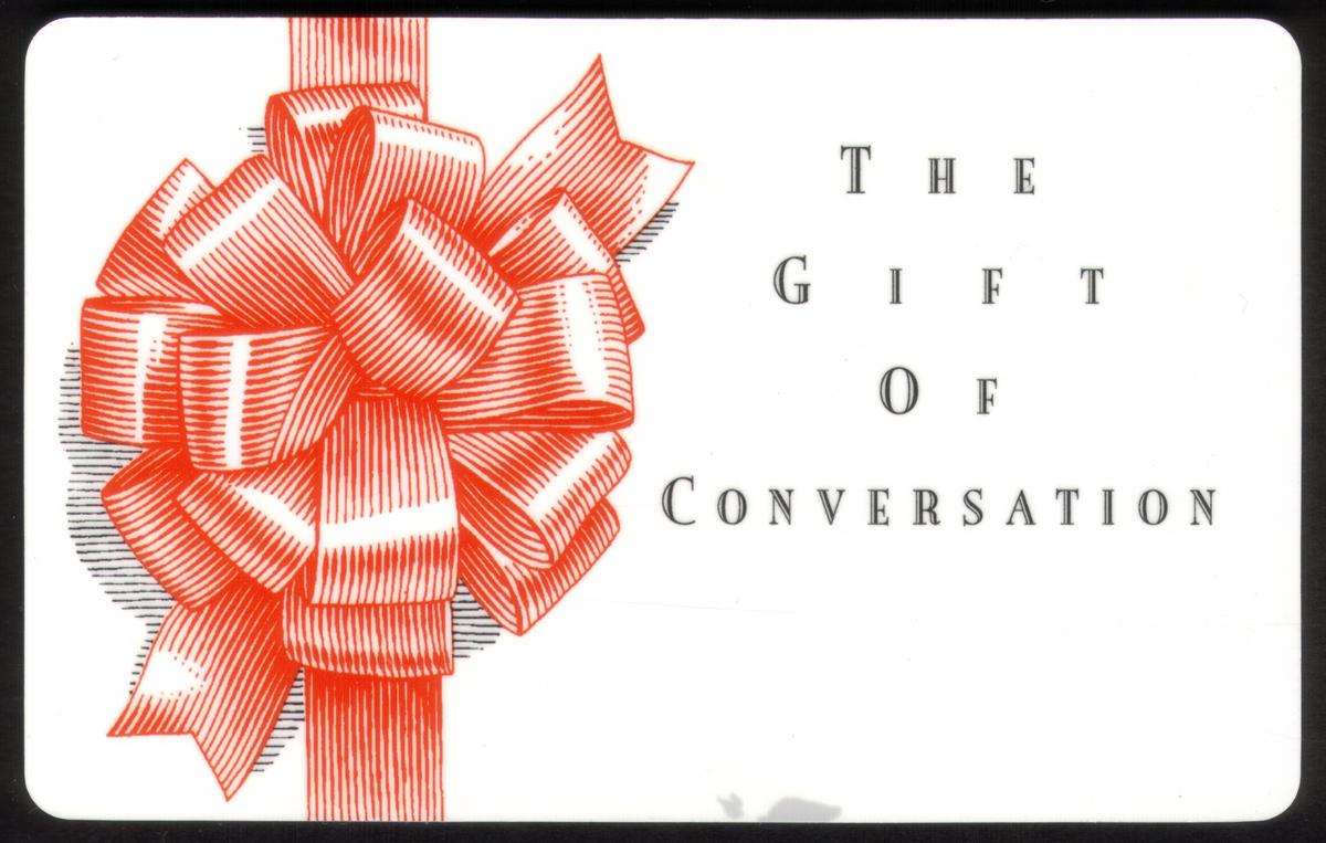 The design is polished and bright, reflecting a promotional intent meant to attract contact and connection through conversation. The use of the red ribbon motif strongly associates the card with gift-giving and celebration, likely intended for the holiday season or special occasions where conversation and connection are emphasized.