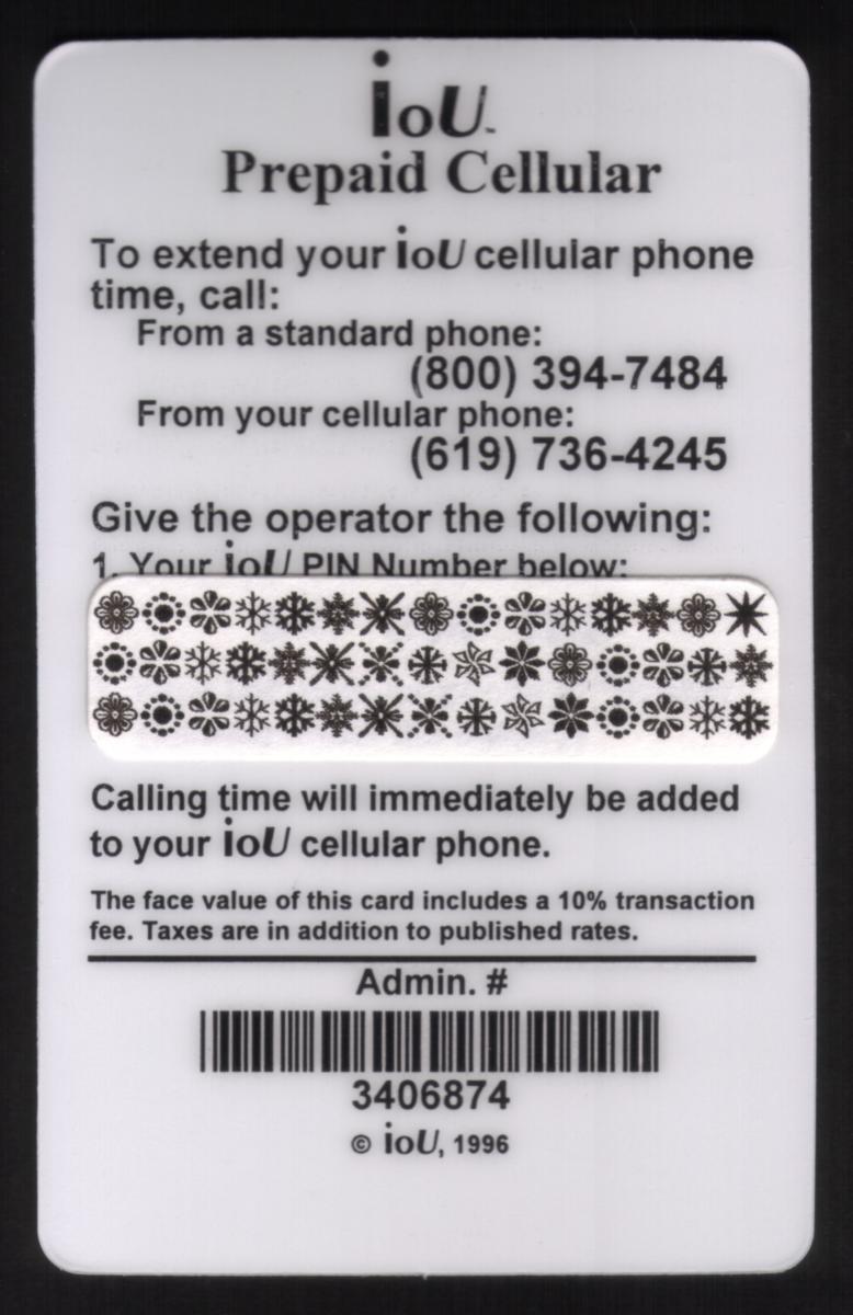 The card displays the text "ioU Cellular" in a modern, minimalist font on the upper left, with "ioU" in larger letters above "Cellular." The value "$25" is printed in bright yellow in the upper right corner. This expired prepaid phone time card was issued by ioU Network Services, representing a piece of telecommunications history showing branding and imagery from early cell phone technology.