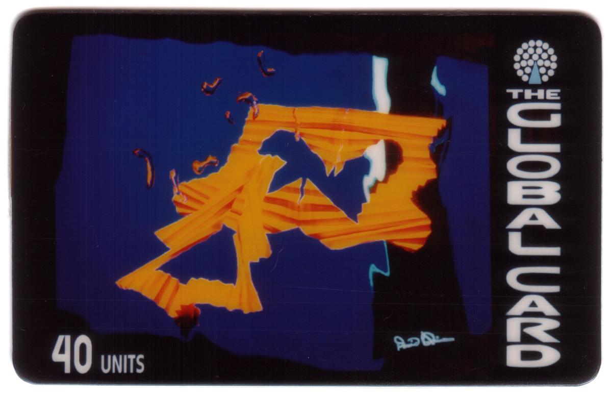 The card is branded as "THE GLOBAL CARD" with the text vertically aligned on the right side, accompanied by a distinctive tree-like logo above the name. The bottom left corner indicates the card’s value as "40 UNITS," denoting its usability as a prepaid telephone card within the Global Tel. Solutions network.