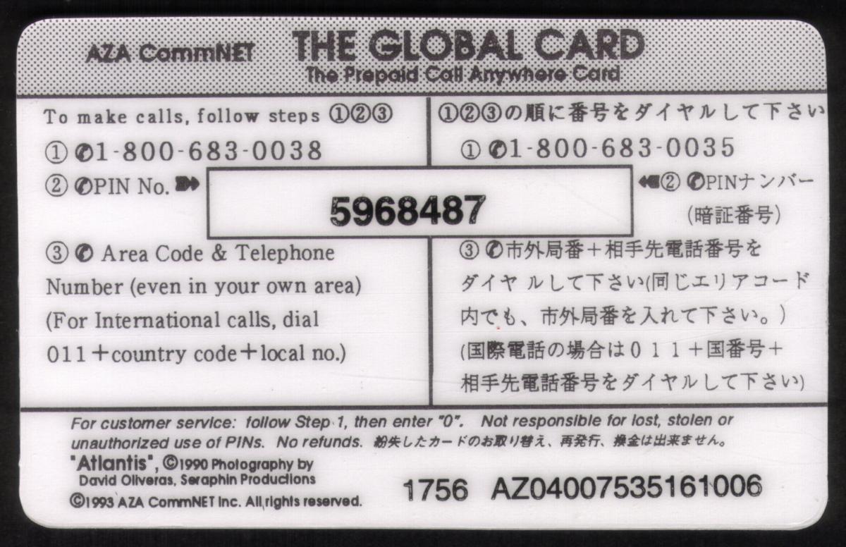 This phone card is part of the AZA CommNET collection, which showcases photographic and artistic themes. It belongs to the artistic, artwork, and young artist series from Seraphin Productions, emphasizing the fusion of creativity and telecommunications. The card represents a collectible piece within the phone card art gallery, reflecting a blend of functional use and visual appeal.