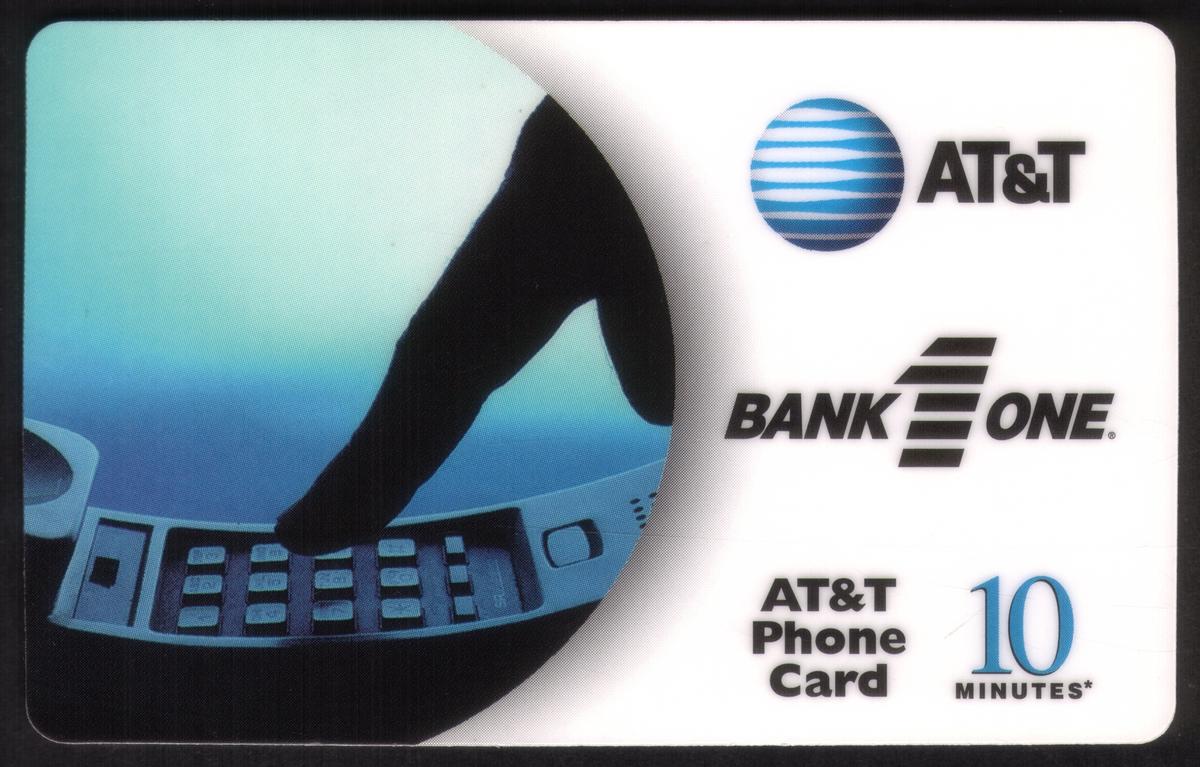 At the top left portion of the card, text reads: “BANK 1 ONE” in uppercase letters, with the number “10M” next to it, indicating the card’s value. The phone keypad is clearly visible with a finger pressing one of the buttons, reinforcing the banking and telecommunications theme. The card’s overall design combines elements of banking and telephony to highlight promotional collaboration between Bank One and AT&T.