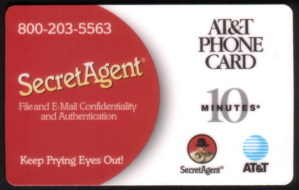 This collectible phone card features a bold, graphic design centered around the theme of secrecy and secure communication. Prominently displayed on the card is an image of a black motorcycle helmet, representing a "secret agent" persona. The helmet is set against a white background, emphasizing its sleek and mysterious appearance. On the right side of the card, clear text reads: "800-203-5563 10m SecretAgent File and E-Mail Confidentiality - AT&T," indicating the card offers 10 minutes of service related to secure file and email confidentiality through AT&T.