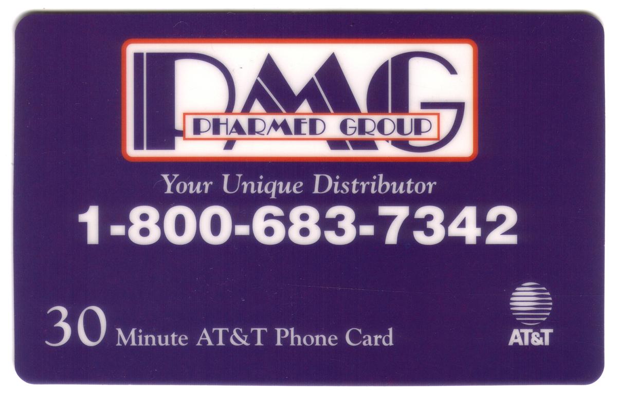 This collectible phone card is a promotional medical card issued by PMG PharMed Group, featuring the phrase “Your Unique Distributor” prominently. The card is marked with “30m” indicating its usage value of 30 minutes. It includes the word “SPECIMEN,” clearly printed on the card, and displays the AT&T logo. The design is clean and professional, reflecting its medical and promotional theme tied to PMG PharMed Group.