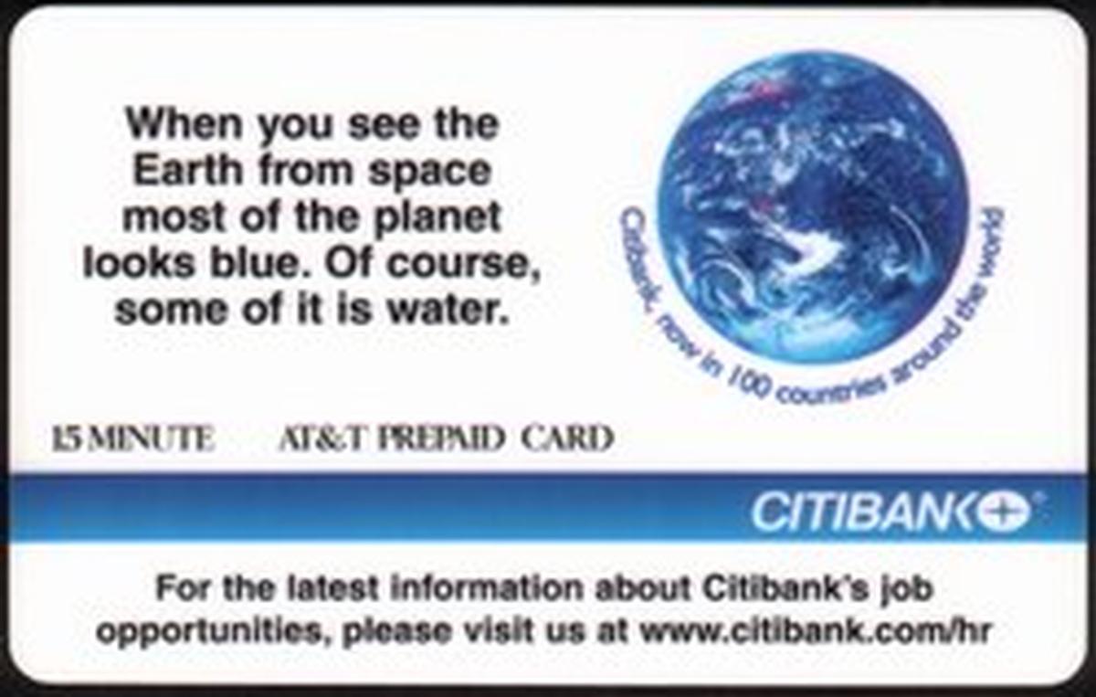 The phone card is branded with the Citibank logo, indicating the card’s association with this major financial institution. Citibank is noted on the card as operating in 100 countries worldwide, servicing 15 million customers. The branding is clear and prominent, underscoring Citibank’s extensive international presence. Additionally, the AT&T logo appears on the card, representing the telecommunications company involved with the phone card.