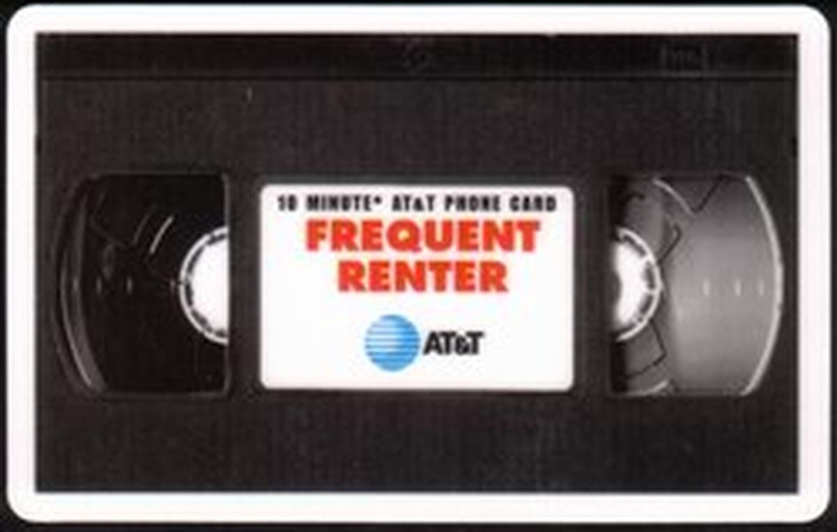 Overall, this card combines the AT&T brand with a classic video rental theme, using the recognizable VHS tape imagery to reinforce the "Frequent Renter" concept. It serves as a promotional phone card with ten minutes of time credit.