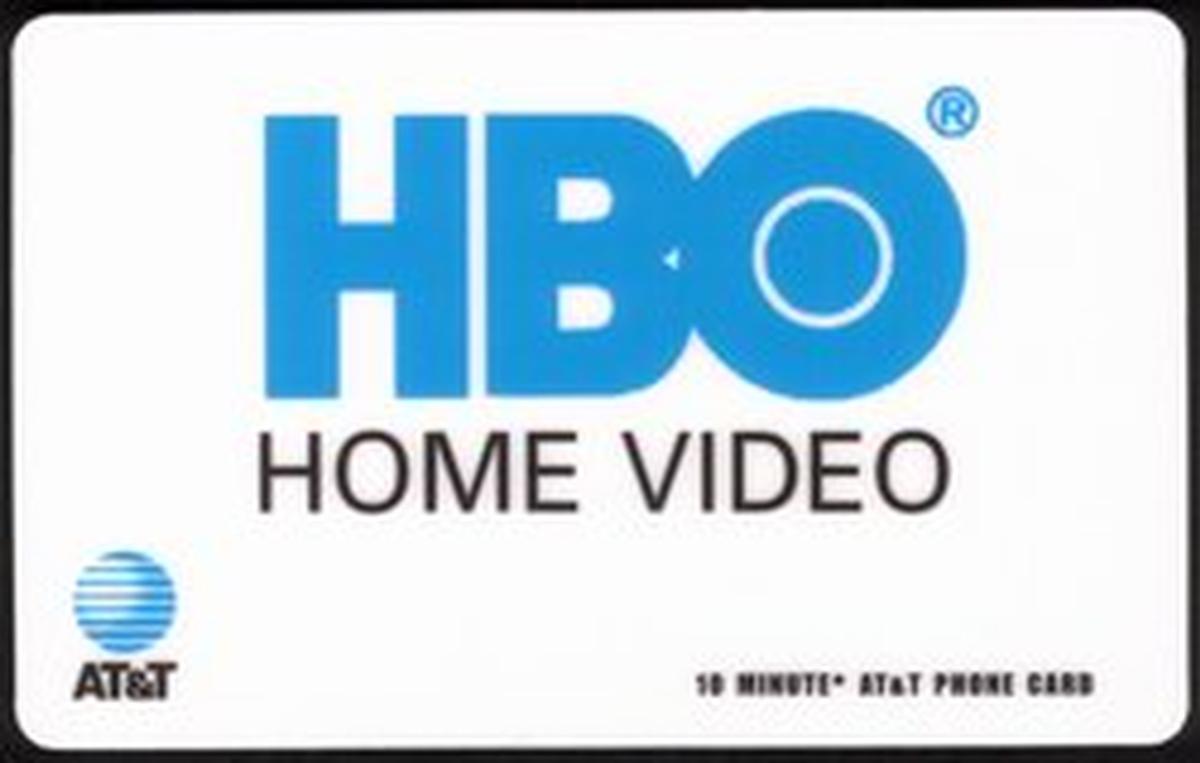 This collectible phone card features a promotional design for a 10-minute HBO Home Video service offered by AT&T. The card’s artwork prominently includes the HBO logo, paired with the AT&T brand, clearly indicating a collaboration between these companies for this home video promotion. The card background incorporates a sleek, modern aesthetic with a gradient of blue tones that convey a digital, professional look.