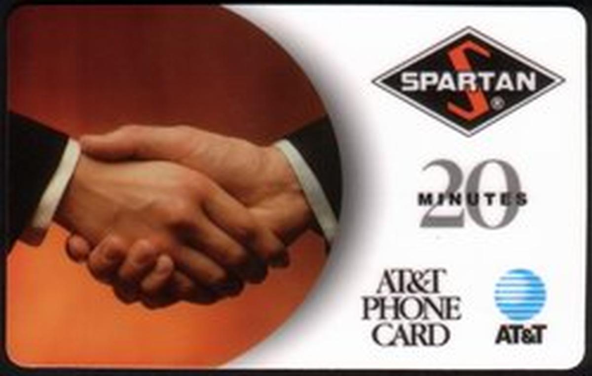 This collectible phone card features a promotional 20-meter design from Spartan Motors. The central image shows two men shaking hands; the figure on the left is wearing a blue shirt, while the other man, facing him, is dressed in a white shirt. Both individuals appear engaged in a professional handshake, conveying a business or agreement theme. The background is a simple, neutral gradient that emphasizes the interaction.
