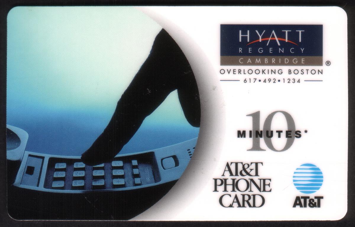 The card includes the logo and name of AT&T, indicating the telecommunications company associated with this item. The text also refers to "Hyatt Regency Cambridge," a notable hotel located overlooking Boston, which situates the thematic connection of the card within travel and hospitality. The card specifies a value of 10 minutes, reinforcing its use for timed telecommunication.