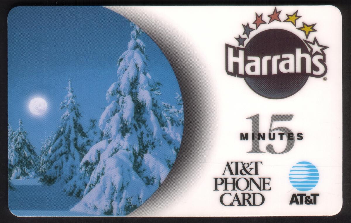 This card blends the natural beauty of a snowy landscape with the promotional identity of Harrah’s Casino, underlining its use as a collectible phone card issued through AT&T.
