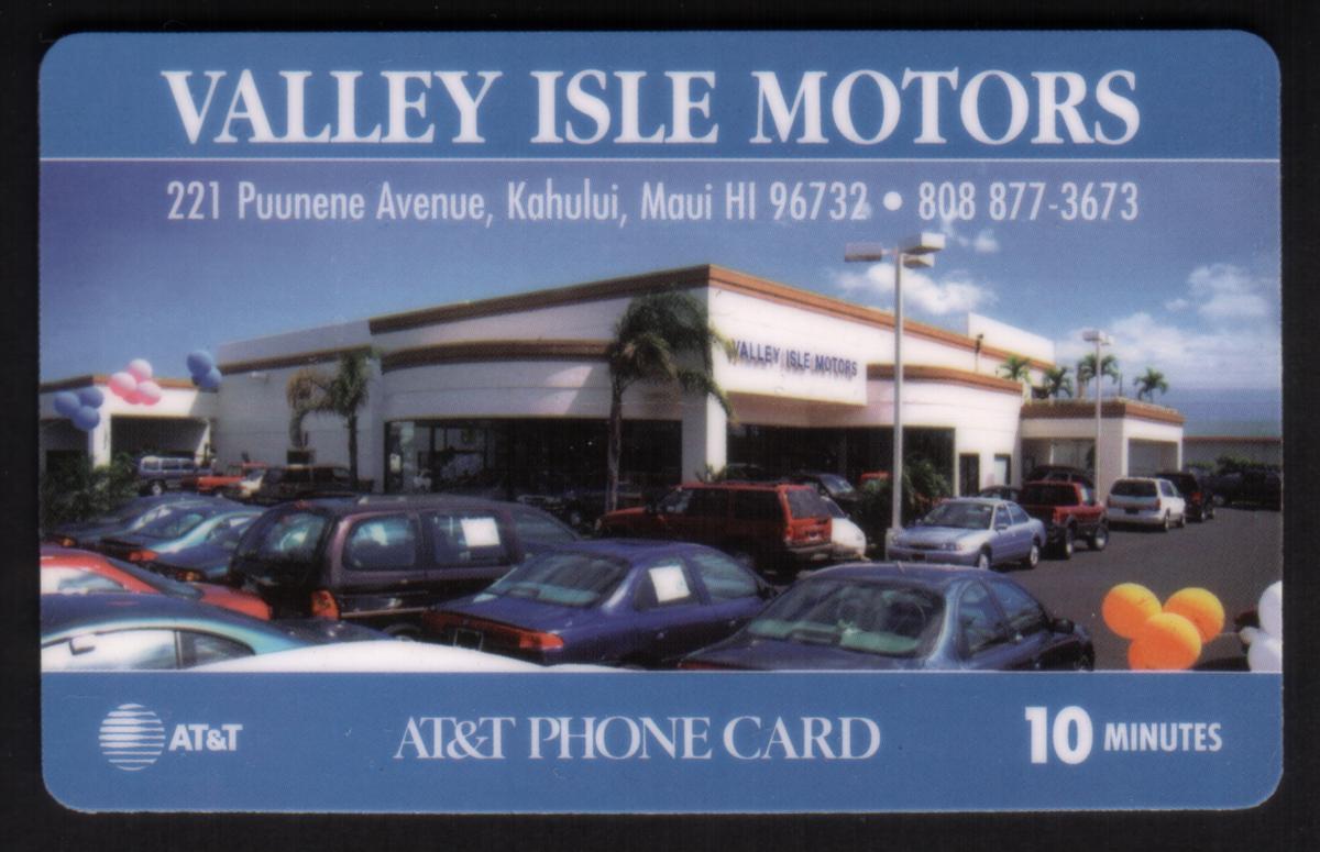 The image includes visual elements connected to Hawaii, with the background displaying a scenic view of lush greenery and a clear blue sky. The design highlights the tropical environment consistent with the location represented by Valley Isle Motors. The card layout includes a discrete chip embedded in the upper right portion, signifying it as a chip-operated collectible phone card.