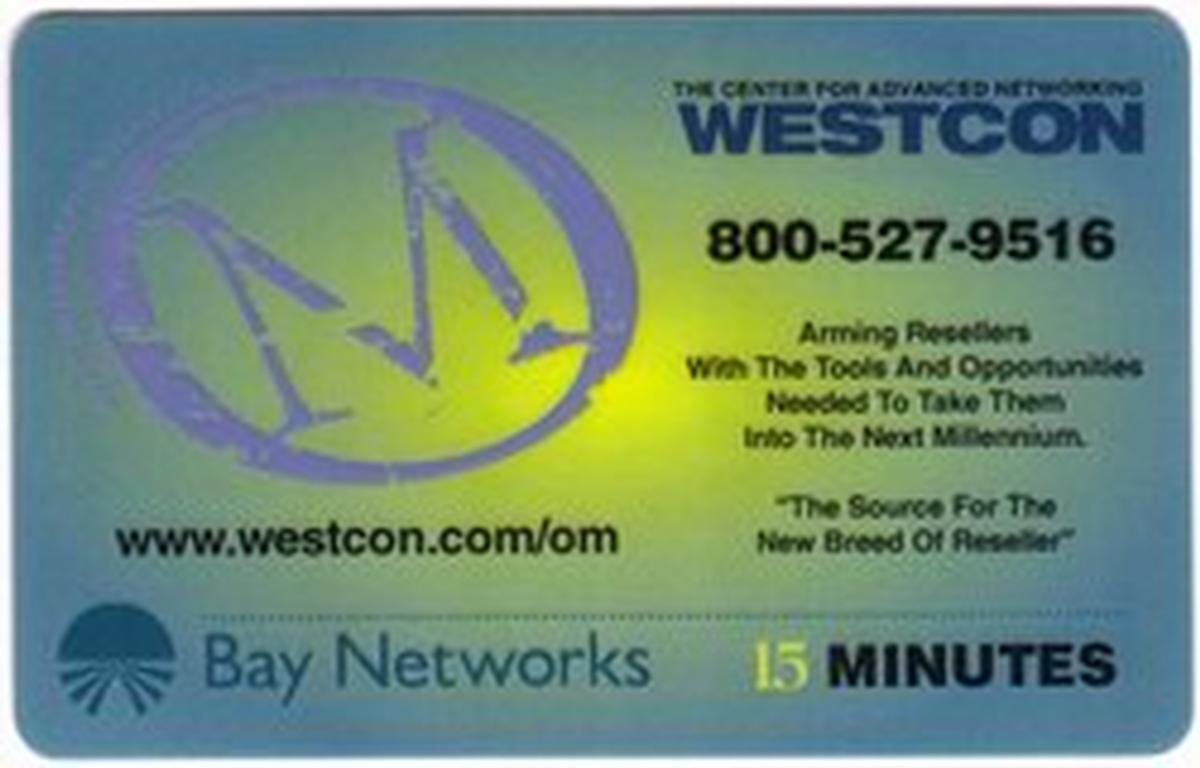 This collectible promotional card features branding prominently associated with Bay Networks and Westcon, recognized as part of “The Center For Advanced Networking,” under AT&T. The design reflects the theme of empowering resellers with advanced tools to elevate their capabilities into the next millennium. The card includes the phrase "armong resellers with the tools needed to take them into the next millennium," indicating a focus on advanced networking solutions and reseller support.