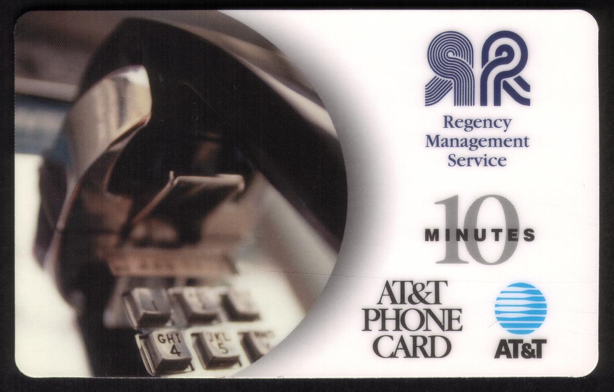 Overall, the card combines corporate branding from AT&T with a clear, close-up photograph of a Regency Management Service payphone. The design emphasizes the telephone equipment and service provider in a straightforward, practical presentation typical of collectible telephone cards.