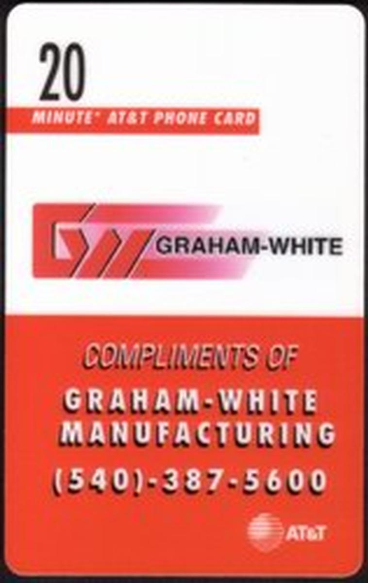 The phone card’s design is straightforward and corporate, focusing on clear brand visibility and the card’s value as a prepaid calling card. The promotional nature, combined with the specific 20-minute prepaid timing, targets users who need a reliable calling service. Graham-White Manufacturing’s name is featured, indicating the company responsible for producing the card.