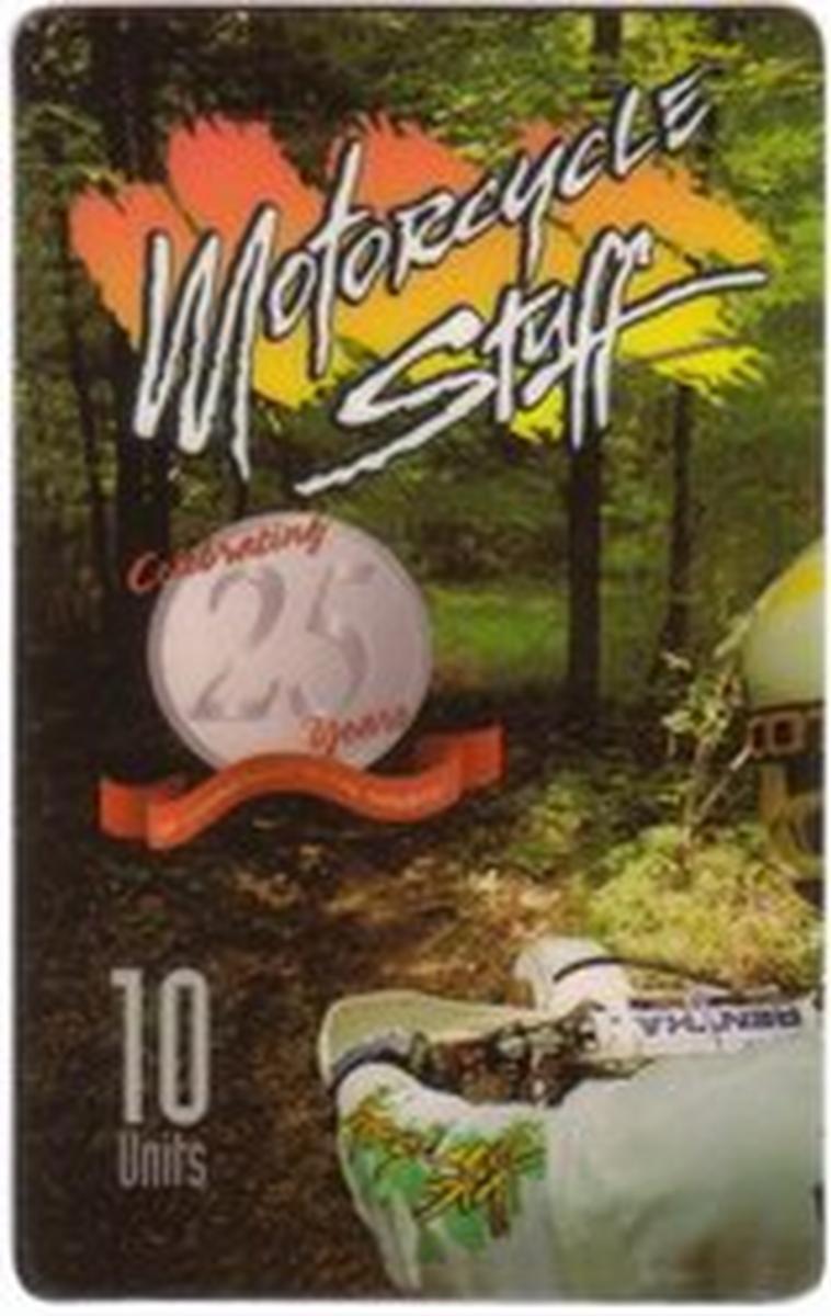 This collectible promotional card commemorates "25 Years of Commitment To The Community" by AT&T. It features the title "Motorcycle Stuff" prominently, emphasizing a focus on motorcycles. The design includes the AT&T logo, linking the card to the telecommunications company. The card highlights the number "10u," which likely refers to a unit or value designation relevant to its promotional nature.