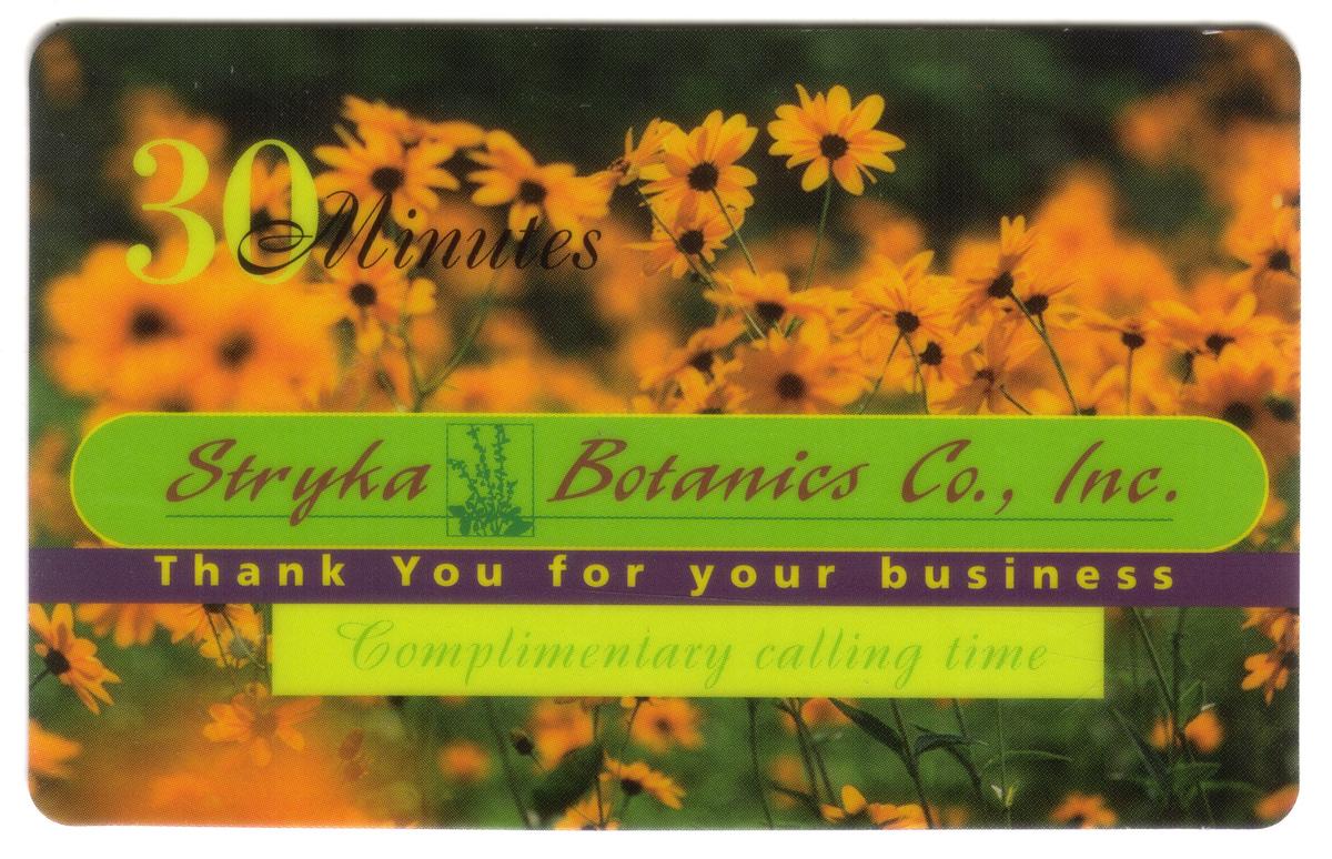 This phone card is entirely focused on the promotional aspect for Stryka Botanics Co., Inc., combined with AT&T's telecommunication branding, making it a collectible item related to corporate promotional phone cards.