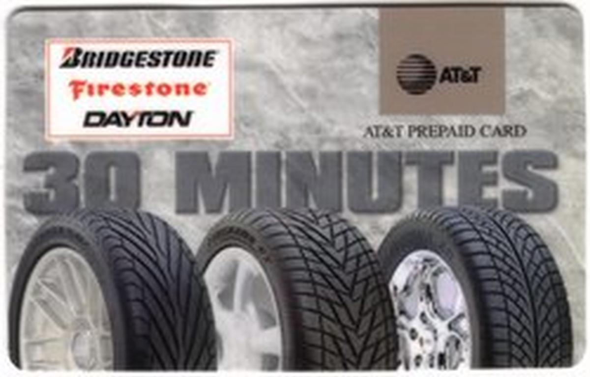 The combination of the Bridgestone, Firestone, and Dayton names positions this card as a promotional item for these tire companies. The design elements are modern and striking, aimed at drawing attention to the tire brands while incorporating the well-known AT&T emblem. This phone card merges corporate branding with collectible appeal through its bold colors and clear company references.