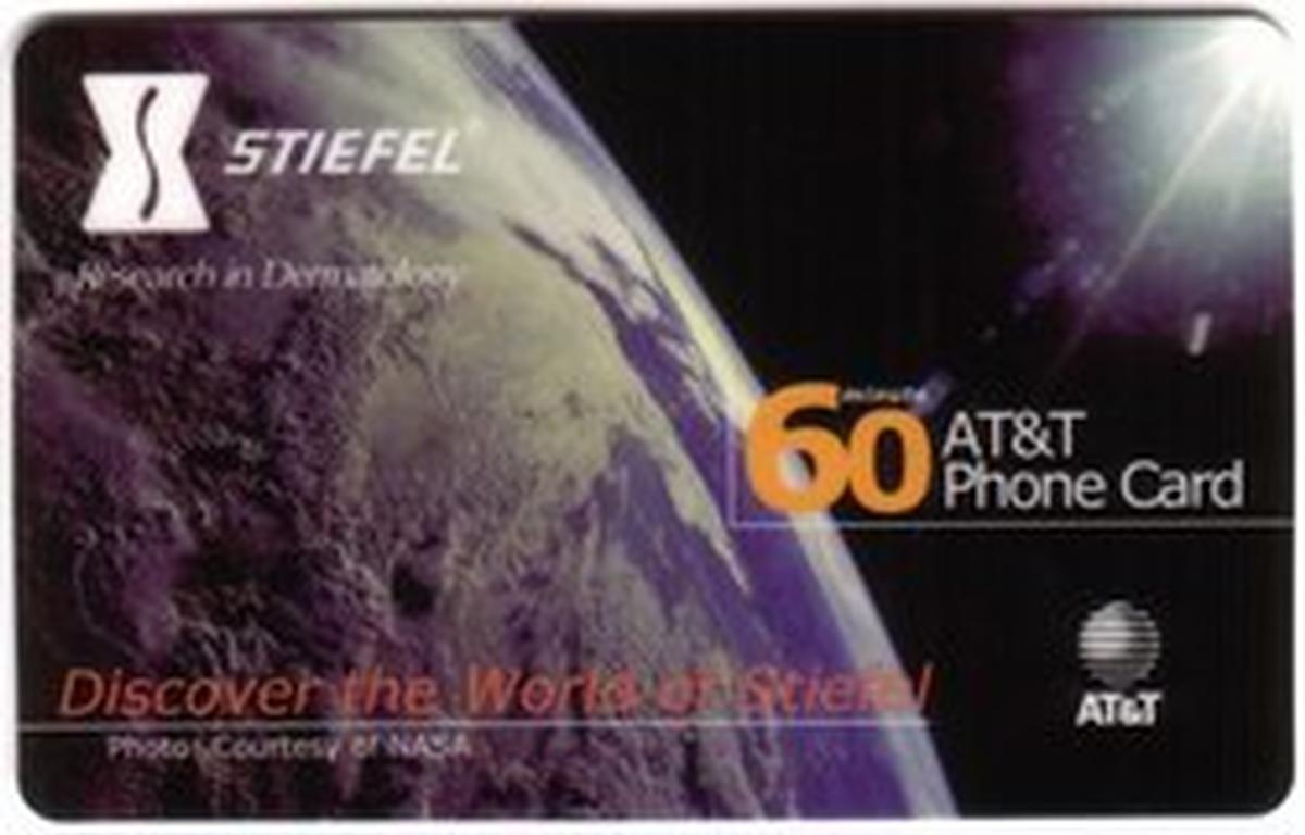 This card is a collectible item that celebrates specialized scientific research with direct references to dermatology and space exploration. It does not include any numerical values or calling details but is clearly branded with NASA, AT&T, and Stiefel, making it a notable promotional piece connecting these entities.