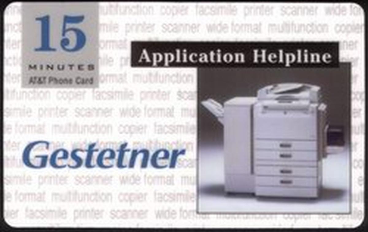 This card is a promotional item distributed by AT&T, designed for use with telephone services. It connects Gestetner Printers and AT&T through its helpline concept, delivering a straightforward visual message about support availability for Gestetner application users. The card’s graphics, logos, and text are clear and crisp, supporting its function and collectible status.