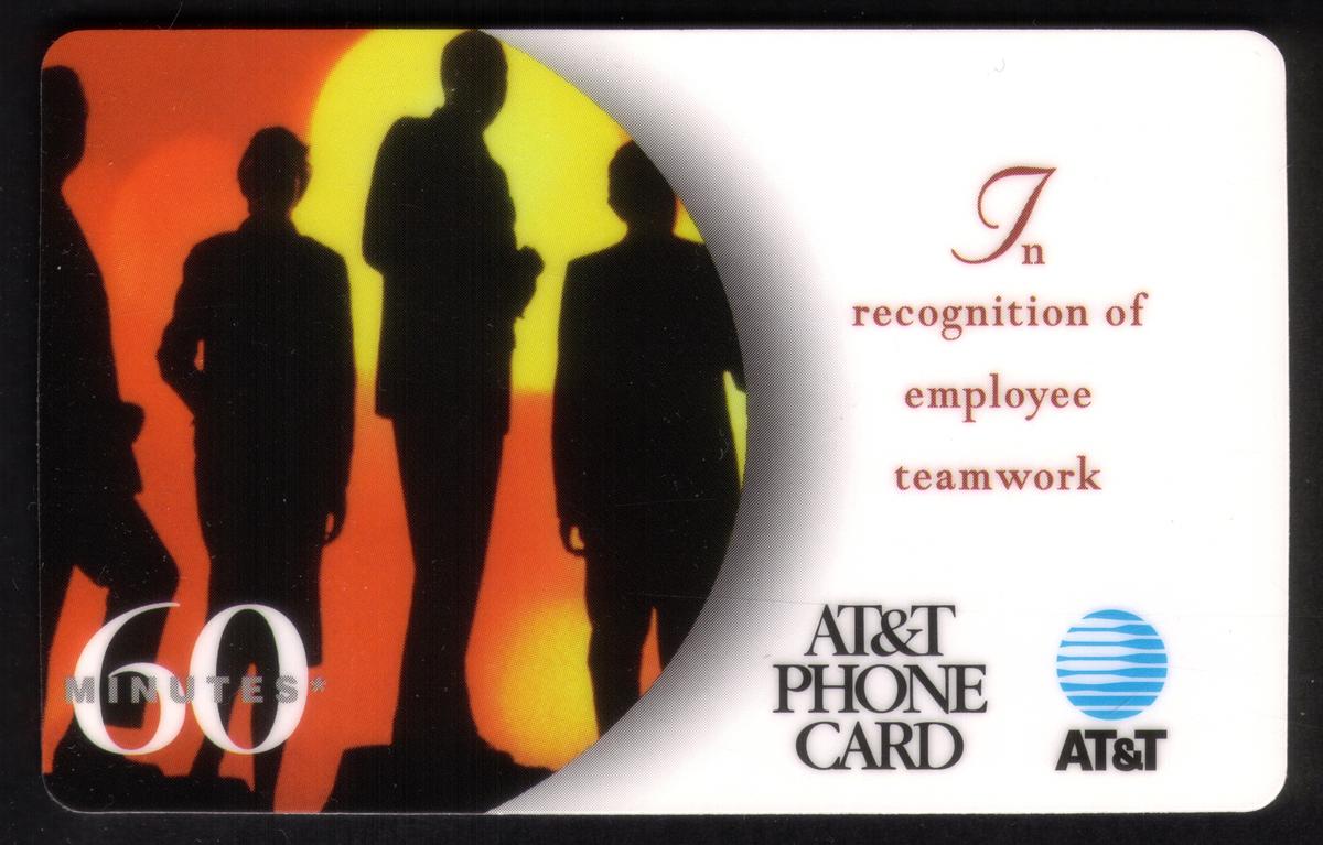 This collectible phone card is promotional in nature and features four silhouetted figures standing in a half circle, symbolizing employee teamwork. The four people are depicted in black silhouettes with discernible postures emphasizing collaboration and unity. The text “...Employee Teamwork” is displayed prominently alongside the figures, reinforcing the card’s recognition of teamwork efforts.