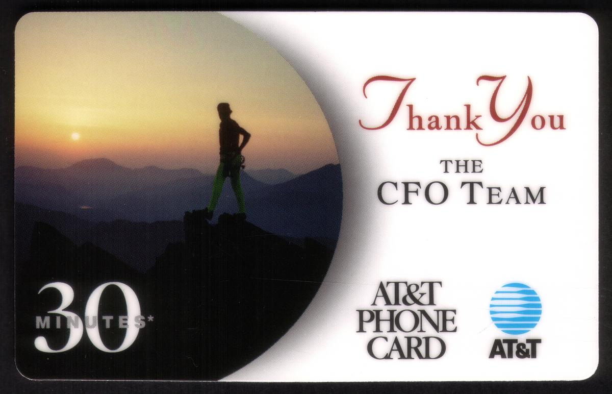The card’s visual focus is on the lone figure and the landscape, with no additional text or imagery interrupting the natural setting. The photograph captures detailed textures of the mountain rocks and the person's clothing, emphasizing the peaceful moment at dusk. The card is identified as a promotional item related to AT&T and features the words "Thank You - The CFO Team," making it a distinctive collectible.