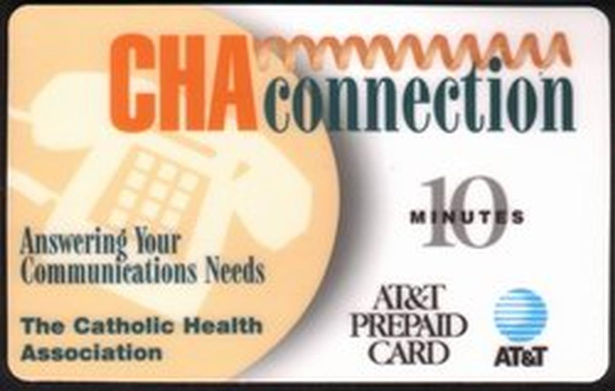 This phone card is part of a promotional series linked to CHA Connection and AT&T, intended for short duration calls, specifically up to 10 minutes. It provides a practical collectible item aligned with Catholic Health Association’s communication goals.