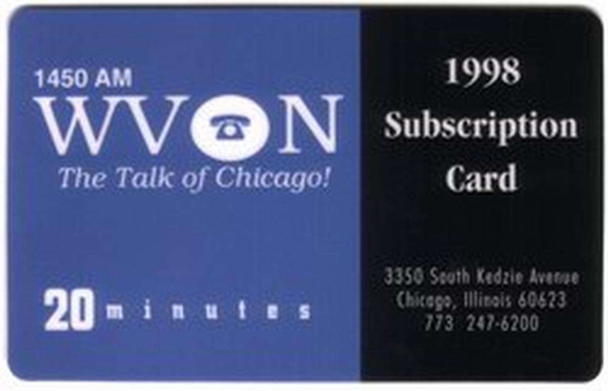 This promotional card is a collectible item linked to the 1998 subscription campaign for WVON Radio, a station known historically for serving the Chicago area. The card combines radio broadcasting branding with major telecommunications companies, making it a unique piece reflecting media and telecom partnerships during that time.