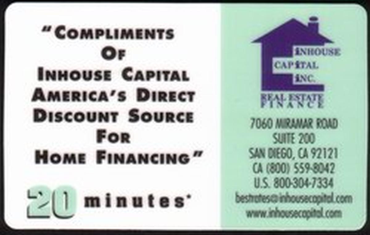 This collectible promotional card is presented by Inhouse Capital America’s Direct Discount Source for Home Financing, Real Estate, San Diego California. The card highlights a clean, modern design featuring the logos of Inhouse Capital America and AT&T prominently. The text "Compliments of Inhouse Capital America’s Direct Discount Source For Home Financing" is clearly printed, emphasizing the company’s focus on home financing services within San Diego.