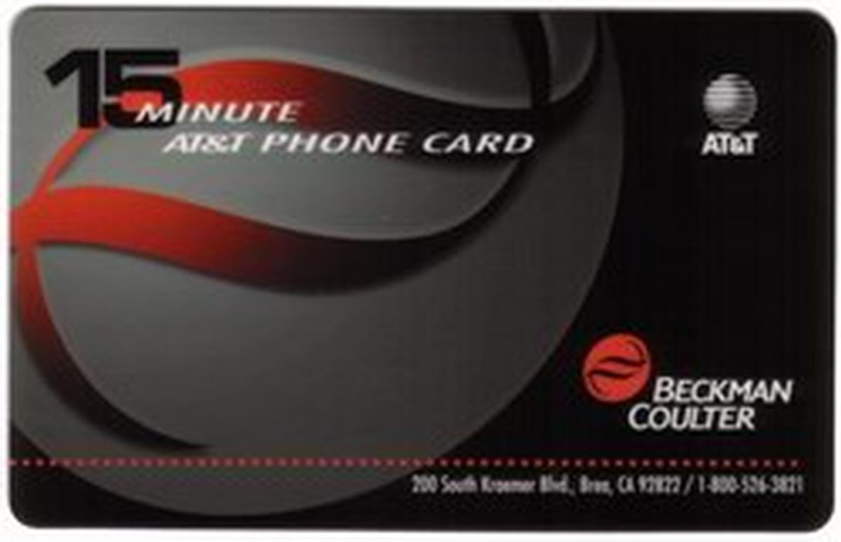 This card is a promotional specimen issued by AT&T with a value of 15 minutes, specifically associated with Beckman Coulter and the state of California. The overall design reflects corporate branding combined with telecommunications service elements.