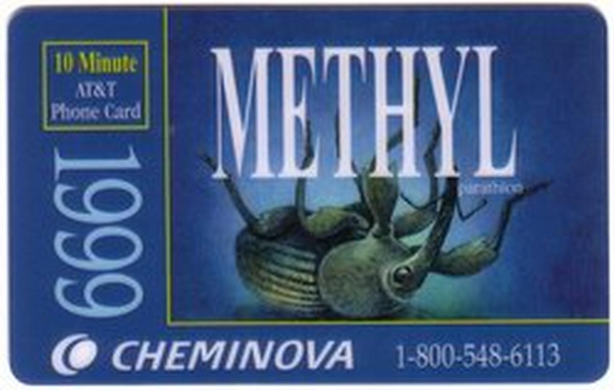 This collectible phone card features imagery related to chemical insecticide use. The card prominently displays dead bugs and insects scattered across a surface, emphasizing the effects of insecticides. The insecticide referenced on the card is Methyl Parathion, with a dosage amount of 10m, produced by Cheminova in 1999. The word "SPECIMEN" is printed, indicating that the card is a sample or special edition.